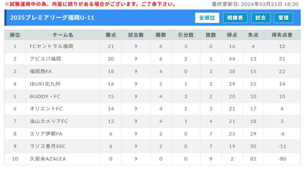 プレミアリーグ福岡U-11 最終結果