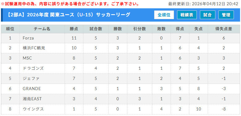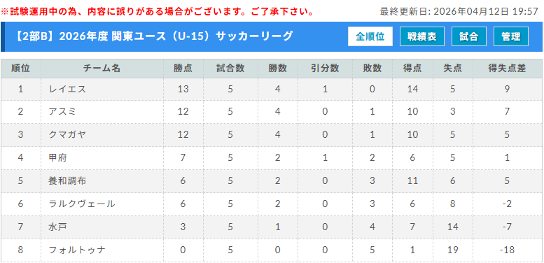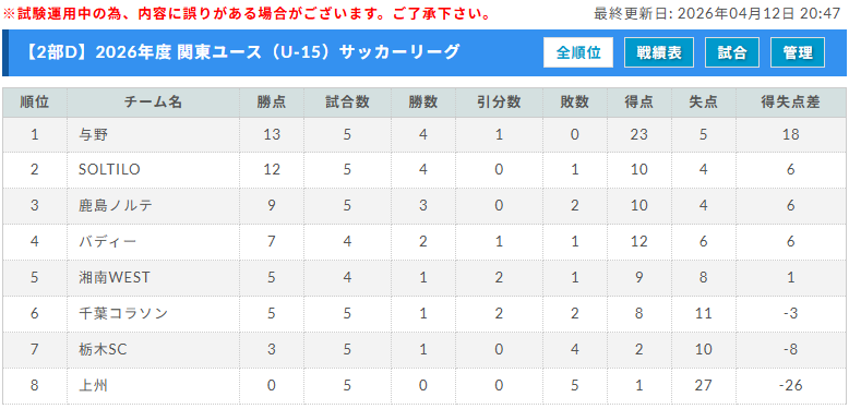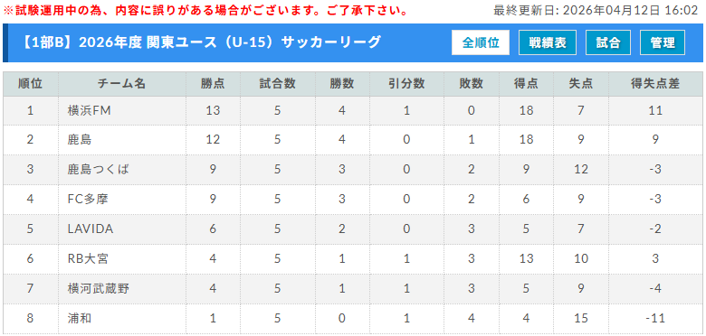 関東U-15L 2部 Aブロック 4/12分まで更新