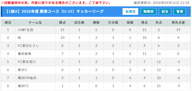 関東U-15L 1部Aブロック 4/12分まで更新