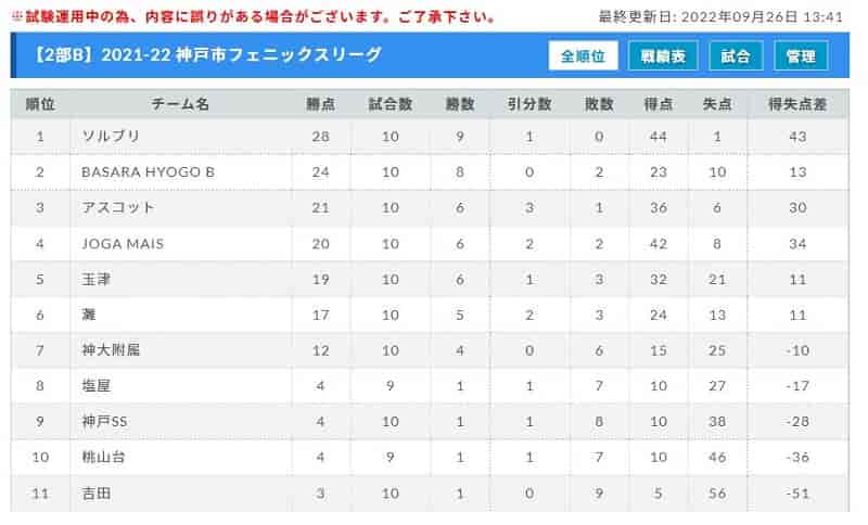 2部B ソルブリジャンテが9勝1分け、負けなしで優勝決定! あと1試合、塩屋 vs 桃山台の情報提供お待ちしています