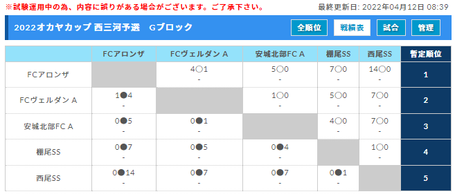 1位:富士松FC、2位:岡崎西SSS、3位:ペレニアルSC、4位:FCリーヴェス、5位:碧南FC