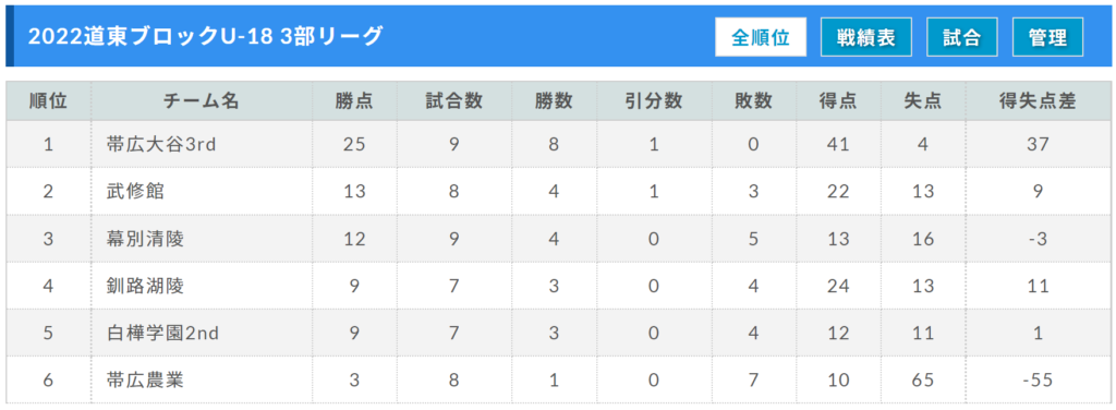 道東ブロックU-18 3部リーグ 9/18結果更新