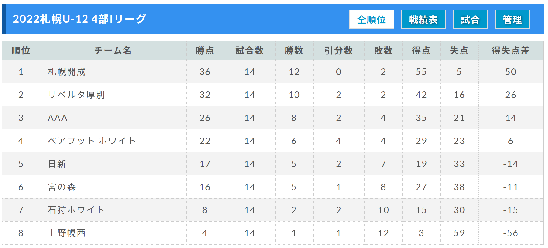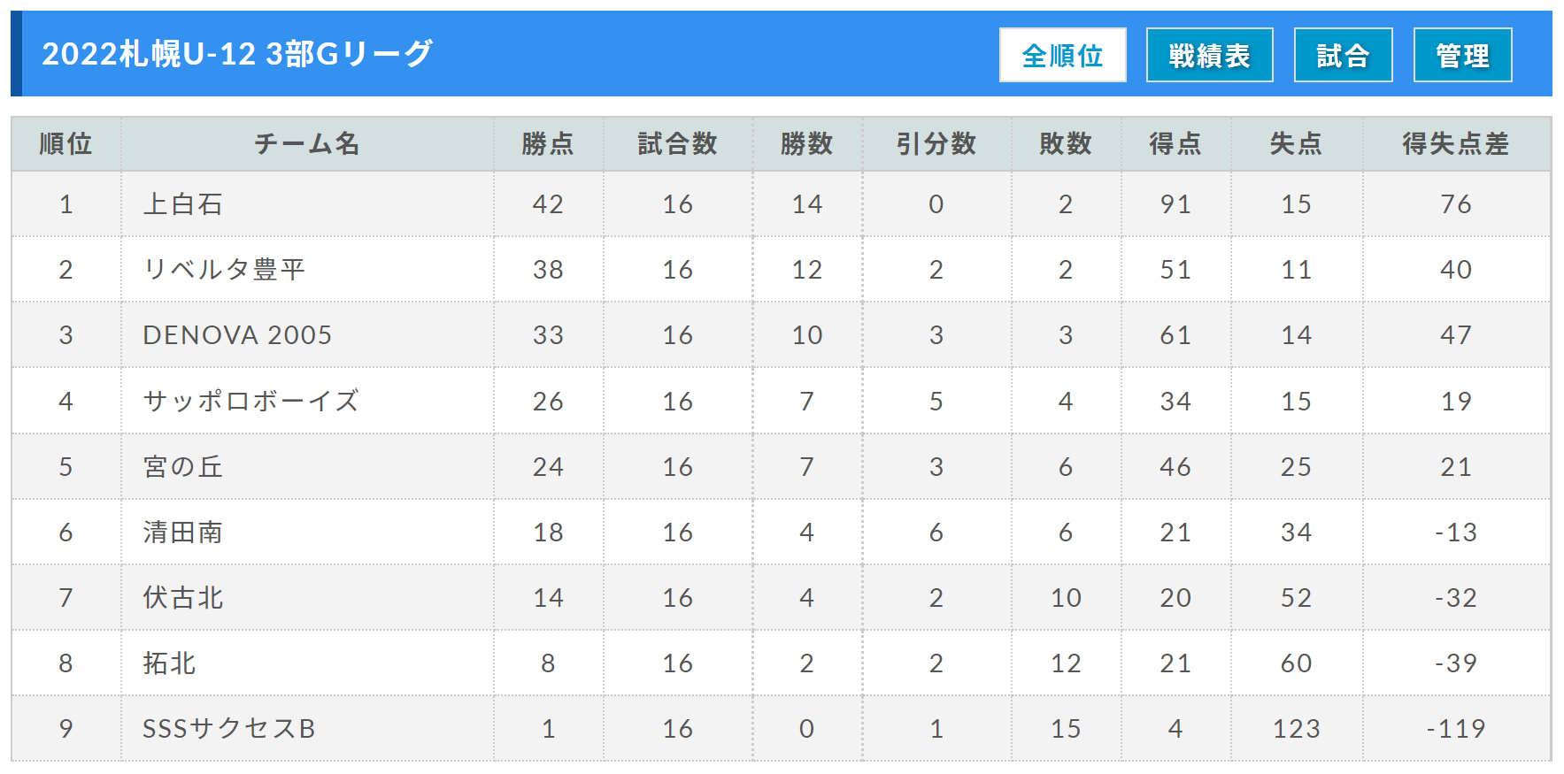 (1)勝ち点(勝ち:3点、引き分け:1点、負け:0点)、(2)得失点差、(3)総得点、(4)対戦相手、(5)抽選の結果とする。また、リーグ戦の総試合数が16試合に満たない場合は、ブロック内で追加の試合を行う。 - JFA第46回全日本U-12サッカー選手権大会(札幌地区プレーオフ又は札幌ブロック大会)について、1・2部の全チーム、3部の1~3位のチームには出場を義務付ける。また、総当たり1回戦の結果、4部1位の3チーム、5部1位の3チームのうち1チームは、出場することができる。