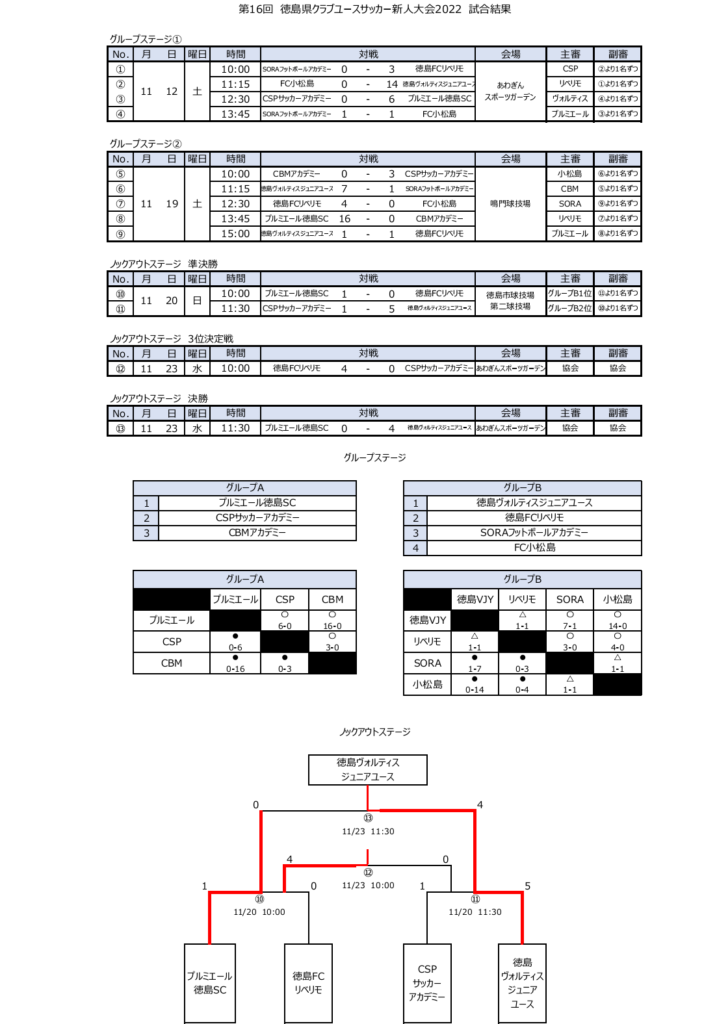 11月12日から行われた第16回 徳島県クラブユースサッカー新人大会の情報をお知らせします。
