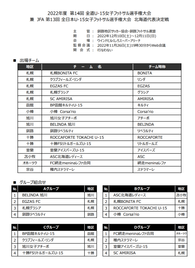 2022年度第14回 全道U-15女子フットサル選手権大会 兼 JFA第13回全日本 U-15女子フットサル選手権大会 北海道代表決定戦