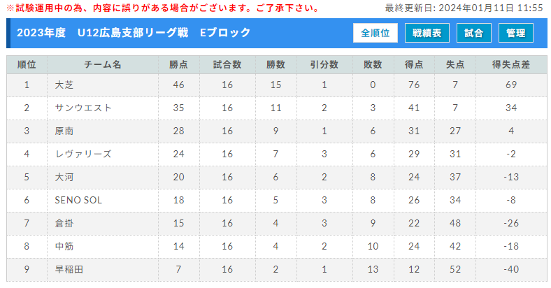 U12広島支部リーグ戦