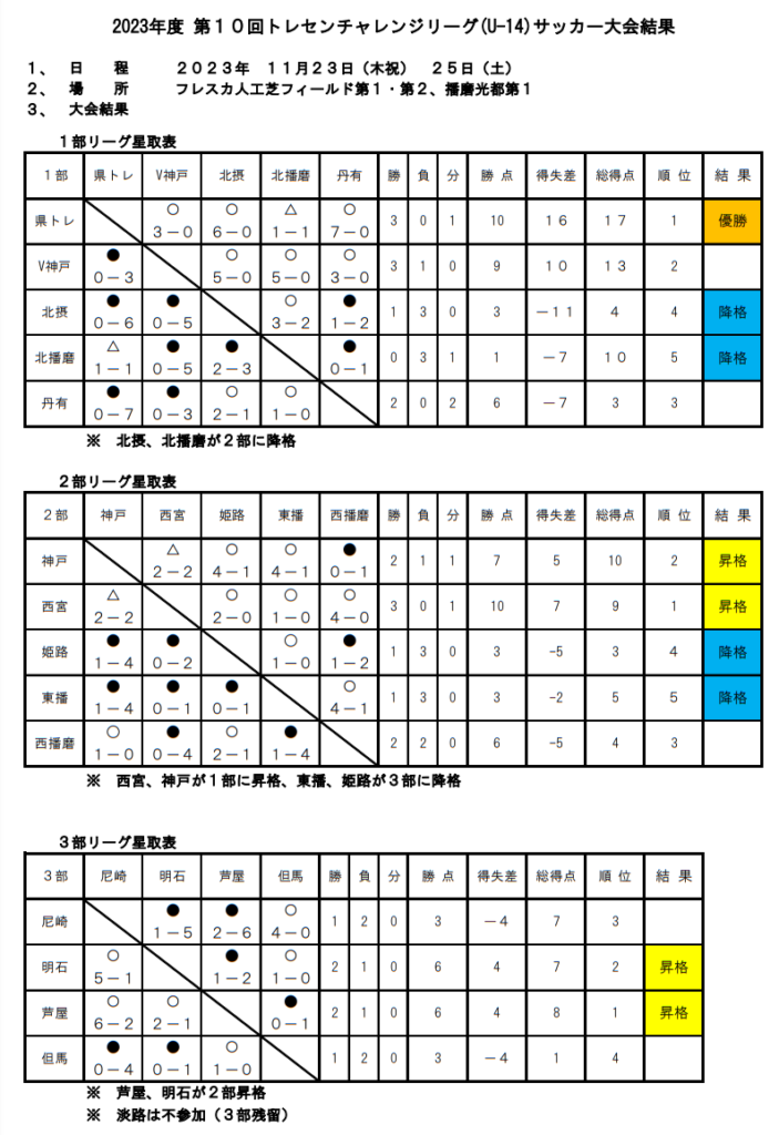 2022年度 第9回兵庫県トレセンチャレンジリーグ(U-14)サッカー大会 1部優勝は県トレセン東!全結果掲載 たくさんの情報提供ありがとうございました