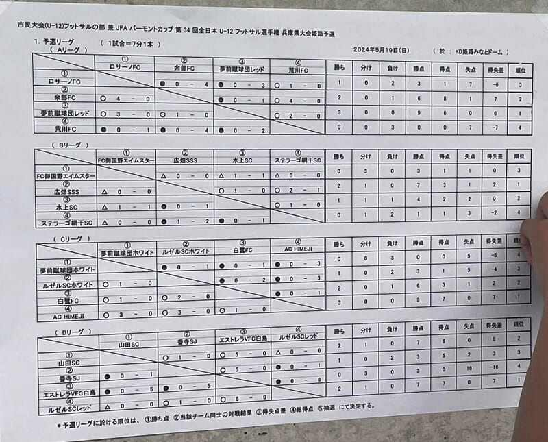 A:1位 デサフィア西宮2位 龍野JSC揖西東、3位 弥生FC、4位 FCリベリオン
