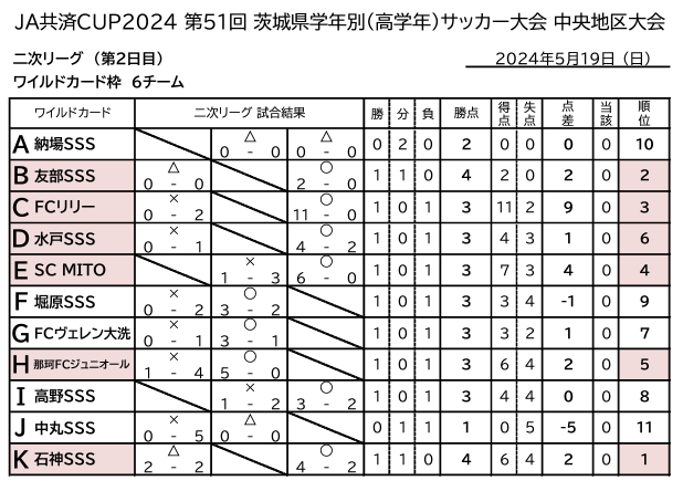 2、二次リーグの2位チームの結果成績を元にワイルドカード対象チームとして順位を決定上位6チームが県大会出場権を獲得。