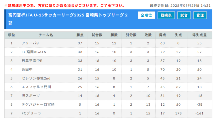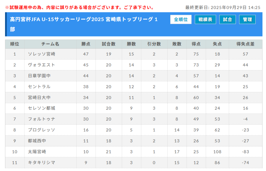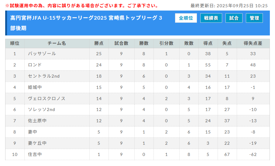 高円宮杯JFA U-15サッカーリーグ2025 宮崎県 後期 暫定順位掲載!優勝はソレッソ宮崎!沢山の結果入力ありがとうございます!
