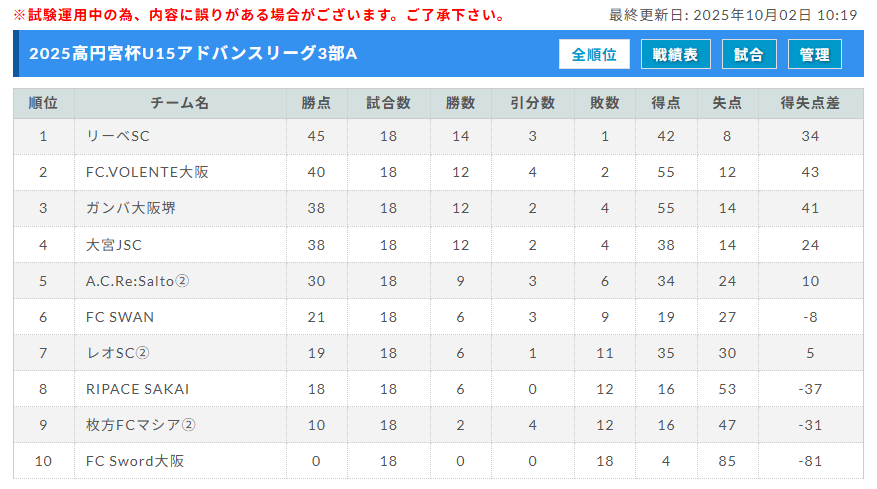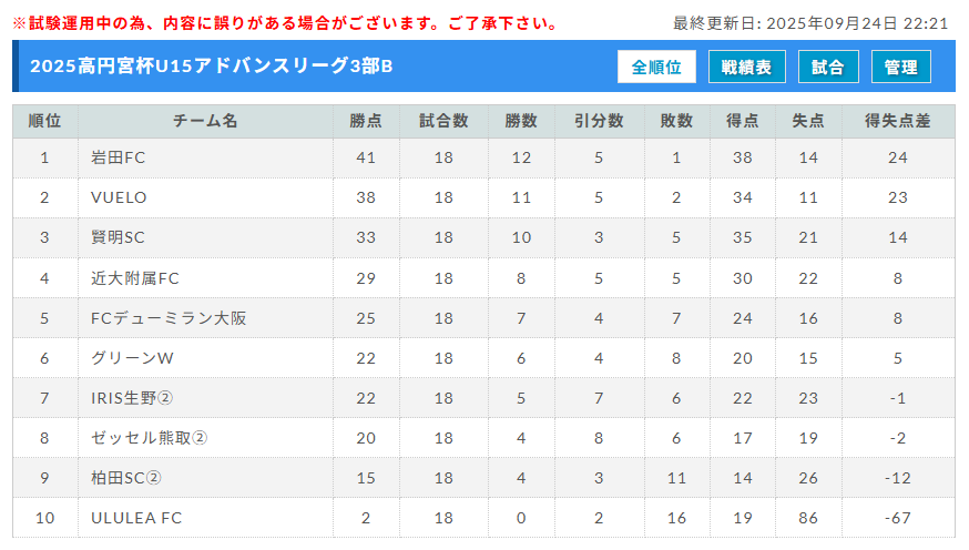 高円宮杯U15サッカーリーグ2025大阪アドバンスリーグ3部