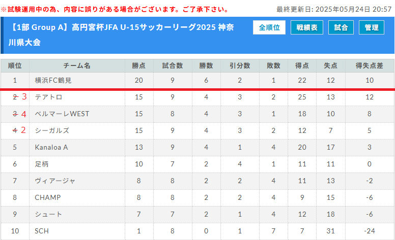 高円宮杯JFA U-15サッカーリーグ2025 神奈川 1部 1stステージ 横浜FC鶴見が1部1回戦総当たり1位で高円宮杯関東大会進出!5/24全結果更新!いつも結果入力ありがとうございます!