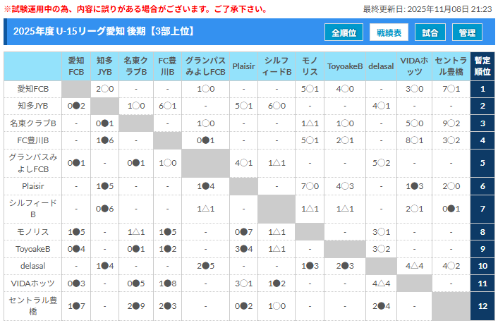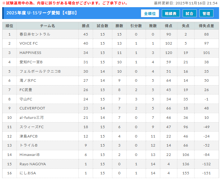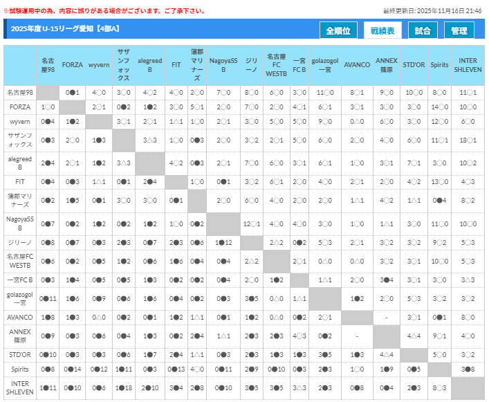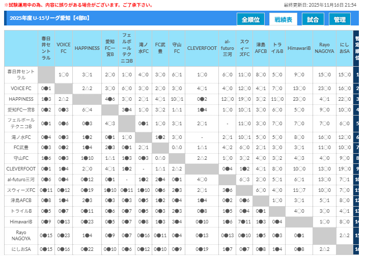 現時点で公式HPより多く結果入力いただいています。公式のリーグ表が更新されましたら順位等照合いたします。