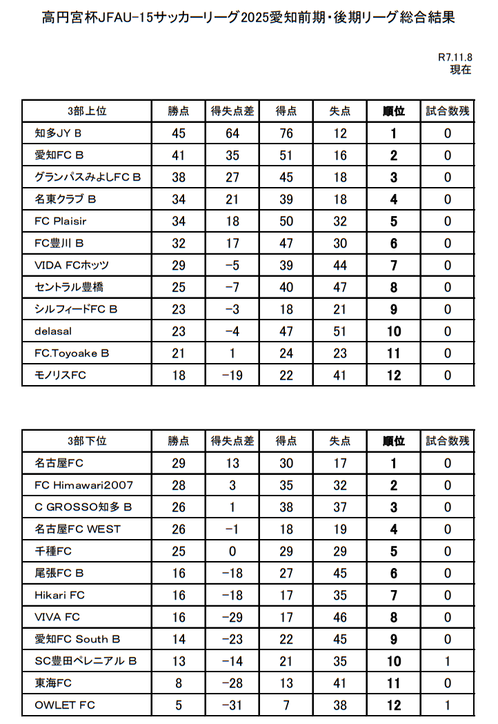 3部後期 下位リーグ【最終結果】11/2 優勝 名古屋FC