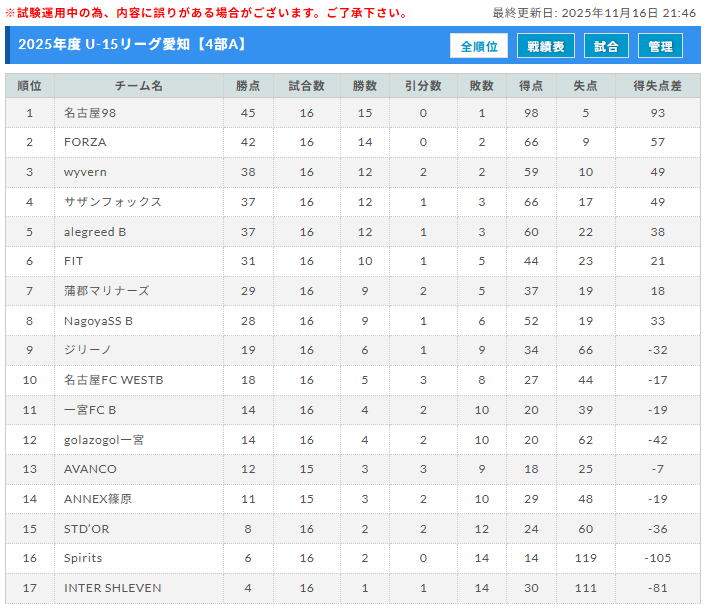 4部Aリーグ 11/15結果更新 優勝 名古屋98FC あと1試合