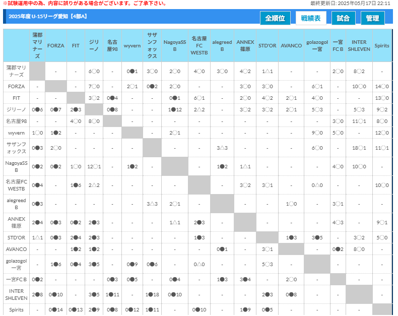 現時点で連盟公式には4試合の登録でしたが、チームSNSには第5節分の結果がありました。
