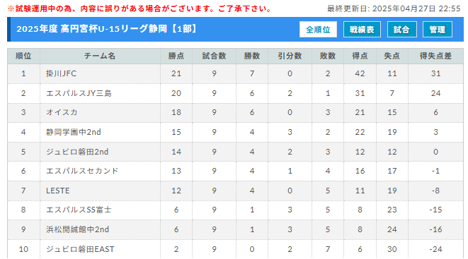 高円宮杯JFA U-15サッカーリーグ2025静岡TOP・1・2・3部