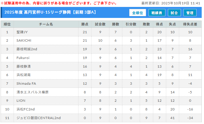 1部リーグ 10/18,19結果更新 優勝 掛川JFC、2位オイスカ!