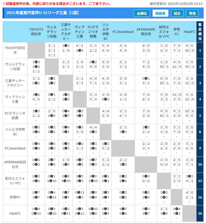 高円宮杯JFA U15サッカーリーグ2026三重3部参入戦の結果情報はありませんか?