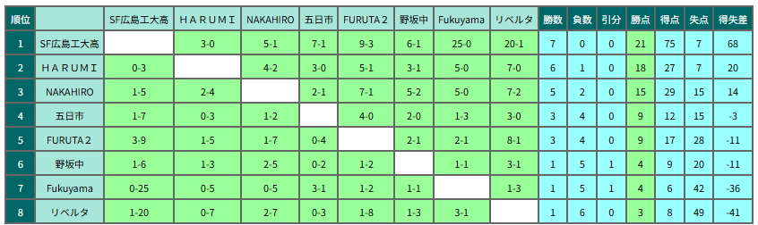 野坂中、五日市、FURUTA2、NAKAHIRO、Fukuyama、HARUMI、SF広島工大高、リベルタ