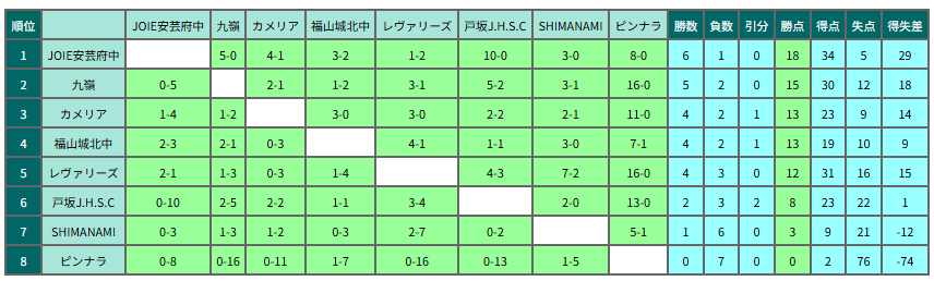 福山城北中、カメリア、レヴァリーズ、九嶺、戸坂J.H.S.C、SHIMANAMI、JOIE安芸府中、ピンナラ