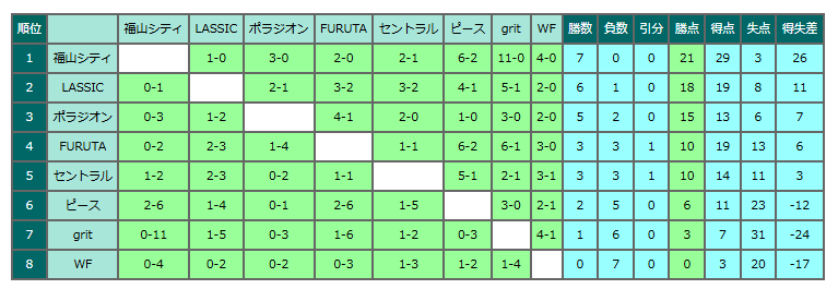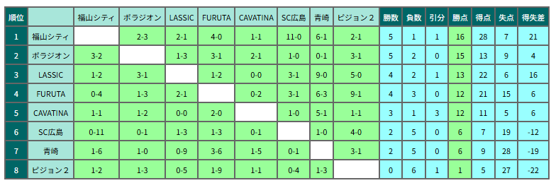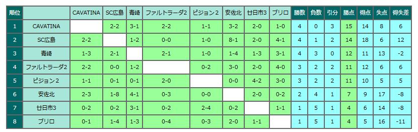 青崎、CAVATINA、SC広島、ファルトラーダ2、ピジョン2、廿日市3、安佐北、ブリロ