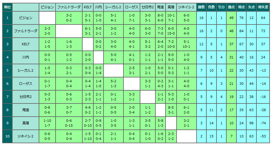 1位:ピジョン、2位:ファルトラーダ、3位:KELT、4位:川内、5位:シーガル2、6位:ローザス、7位:廿日市2、8位:尾道、9位:高陽、10位:ツネイシ2