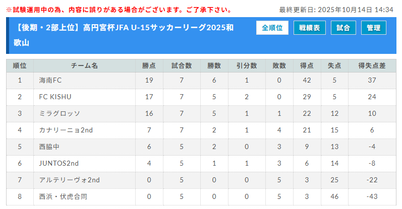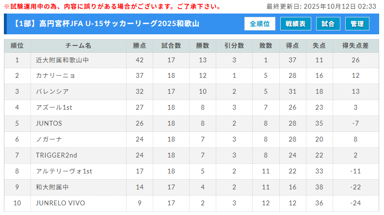 11:10 JUNTOS 3-0 和大附属中リーグ戦表より情報提供ありがとうございます!
