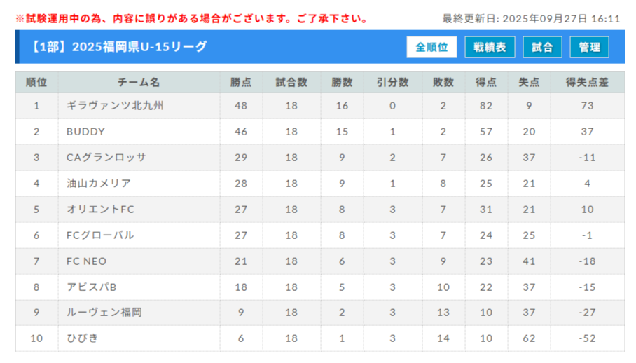 1位:ギラヴァンツ北九州、2位:BUDDY、3位:CAグランロッサ、4位:油山カメリア、5位:オリエントFC、6位:FCグローバル、7位:FC NEO、8位:アビスパB、9位:ルーヴェン福岡、10位:ひびき