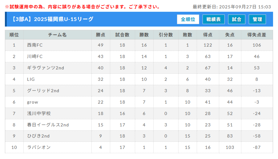 1試合は間違いかいたずら入力かわかりませんが、該当試合を削除しております。