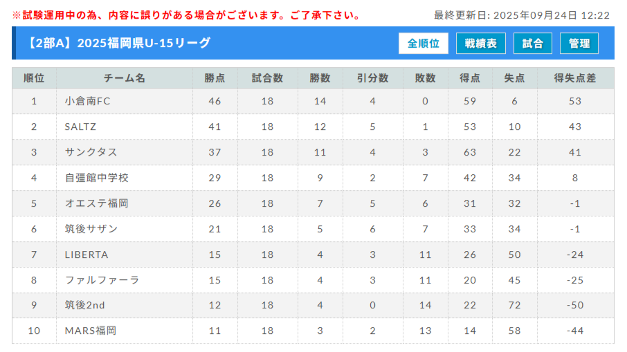 1位:小倉南FC、2位:SALTZ、3位:サンクタス、4位:自彊館中学校、5位:オエステ福岡、6位:筑後サザン、7位:LIBERTA、8位:ファルファーラ、9位:筑後2nd、10位:MARS福岡