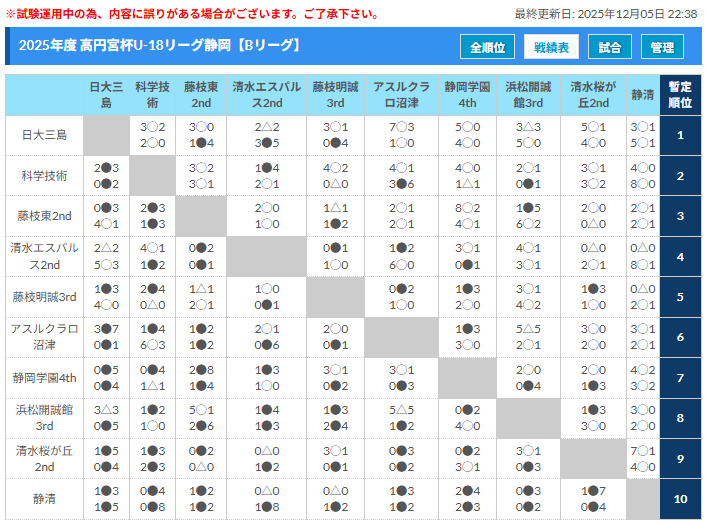 アスルクラロ沼津 3-1 静清※ 磐田東 – 清水桜が丘戦に、1-0と1-4の2通りの結果入力をいただきました。