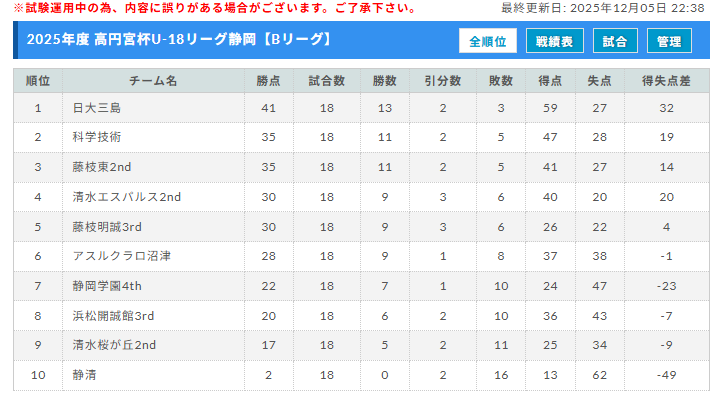高円宮杯JFA U-18サッカーリーグ2025静岡 スルガカップ大会 Aリーグ・Bリーグ