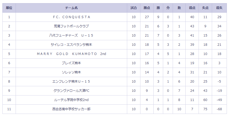 コンクエスタ、サイ・ESP、ブレイズ2nd、八代F、エンフレンテ、マリゴ熊本2nd、ソレッソ3rd、荒尾FC、ルーテル2nd、西合志南中、グランヴァ