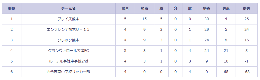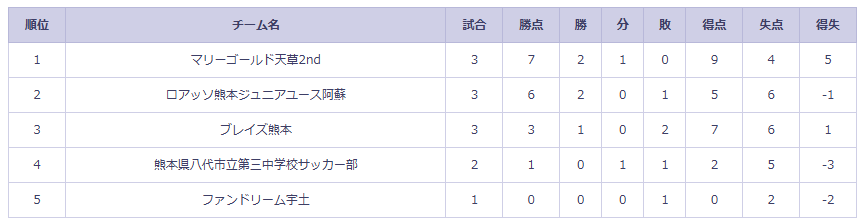 1位:アスフィーダ、2位:UKI-C.FC、3位:ルーテル学院中、4位:リーソル、5位:アルマラッゾ