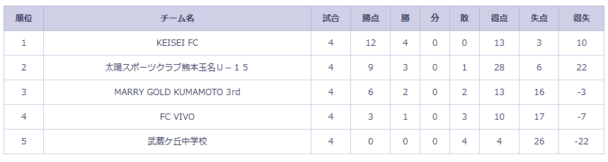 1位:KEISEI、2位:太陽玉名、3位:マリゴ熊本3rd、4位:VIVO、5位:武蔵ケ丘