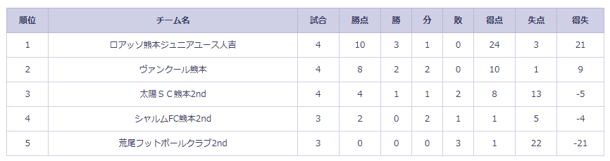 ロアッソ人吉、ヴァンクール、太陽熊本2nd、シャルム2nd、荒尾FC2nd