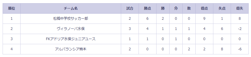 アルバランシア、太陽玉名、松橋中、ヴィラノーバ、マリゴ熊本3rd、VIVO、武蔵ケ丘、FKアドリア、KEISEI