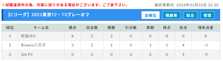 1位:町田JFC、2位:Branco八王子、3位:GA FC