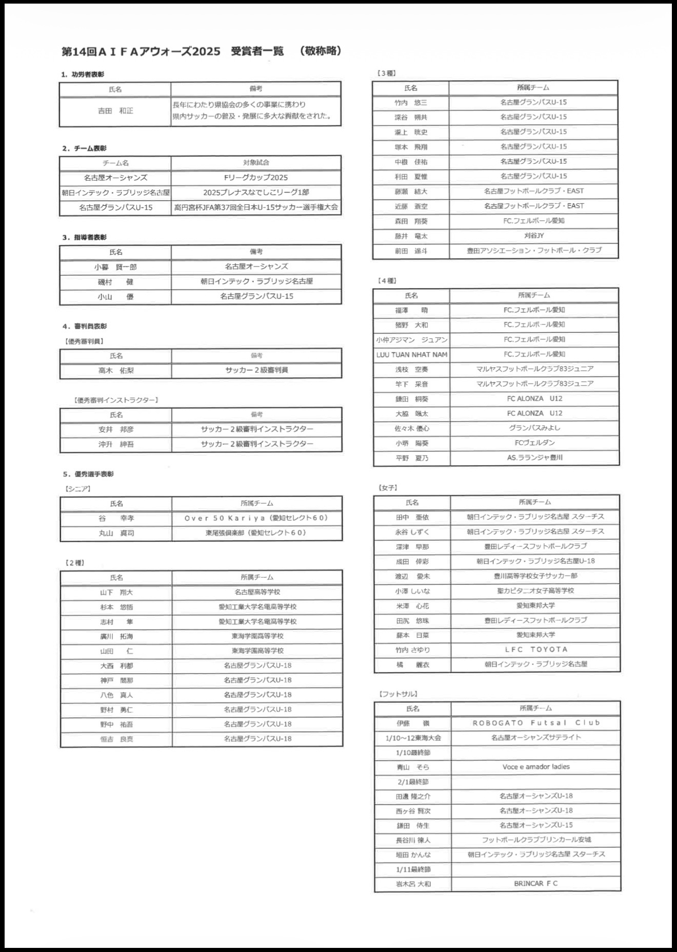 2025年2月9日(日)「第13回 AIFAアウォーズ2024」(公益財団法人 愛知県サッカー協会年間表彰)が開催され、以下の皆さんが受賞されました。おめでとうございます!