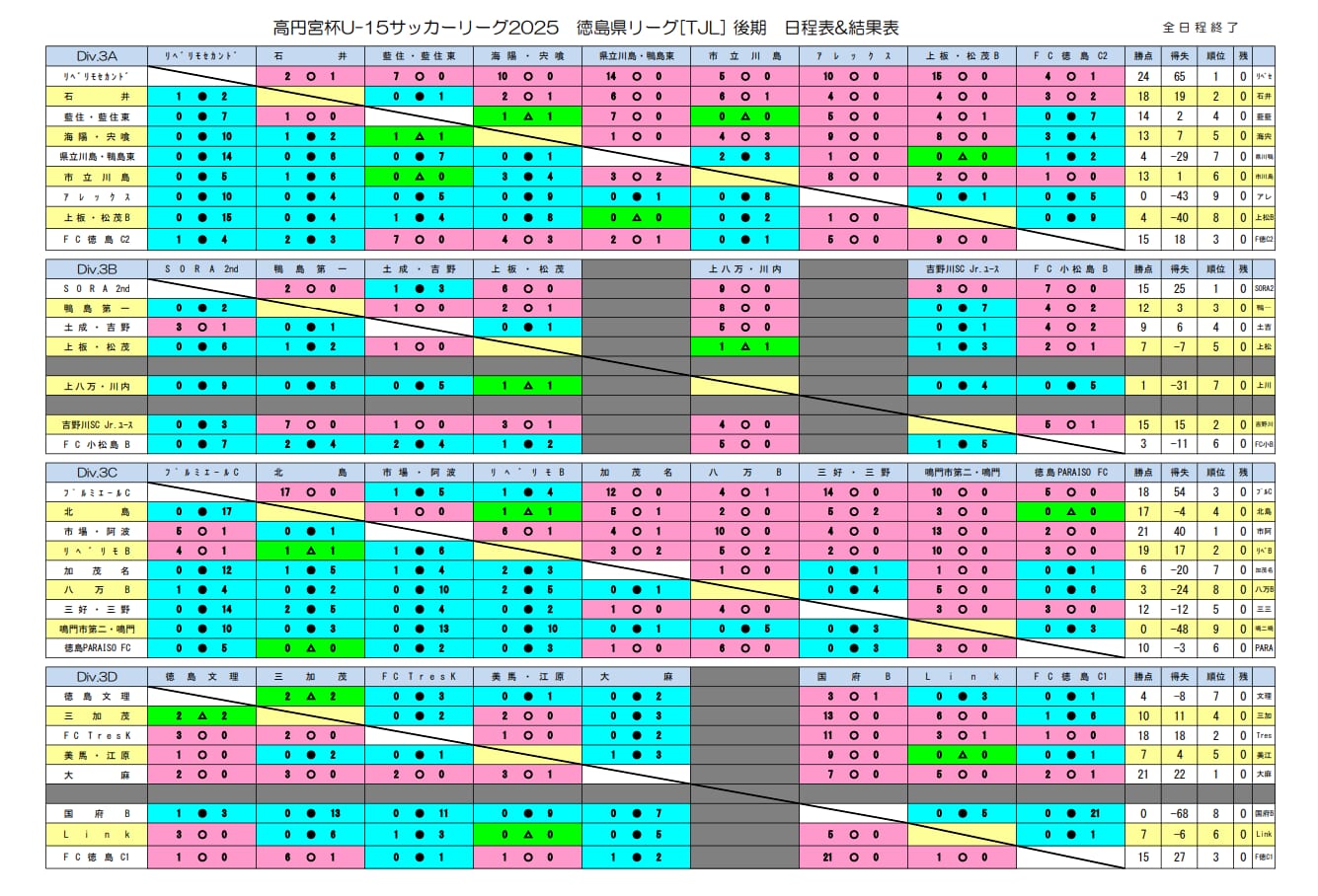 2024年度 高円宮杯U-15サッカーリーグ 徳島県リーグ TJL 1部優勝はCSPサッカーアカデミー! 1部・2部・3B・3D 全節終了!次節・入替戦日程募集