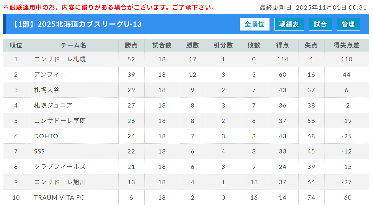 1位:北海道コンサドーレ札幌 、2位:アンフィニMAKI.FC、3位:札幌大谷中学校、4位:札幌ジュニアFC、5位:北海道コンサドーレ室蘭、6位:DOHTO Jrユース、7位:SSSジュニアユース、8位:クラブフィールズ、9位:北海道コンサドーレ旭川 、10位:TRAUM VITA FC