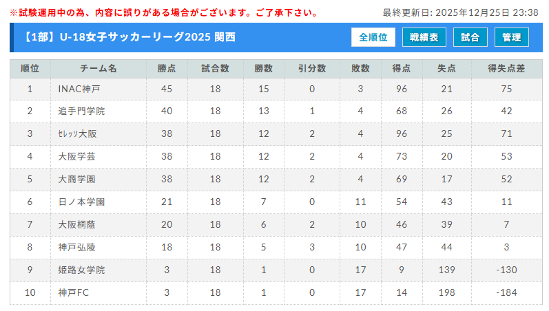 1部リーグ 12/25全試合終了 優勝はINAC神戸レオンチーナ!