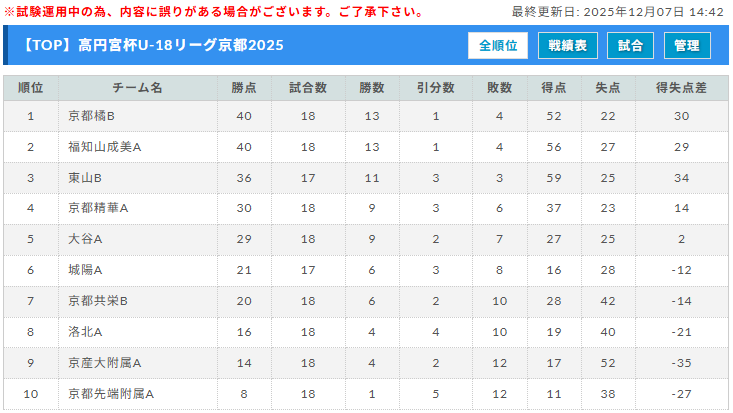 高円宮杯U-18サッカーリーグ2025京都 12/6結果判明分掲載!優勝は京都橘高校!福知山成美高校とともにプリンスリーグ関西プレーオフ出場!東山Bvs城陽Aの試合結果募集