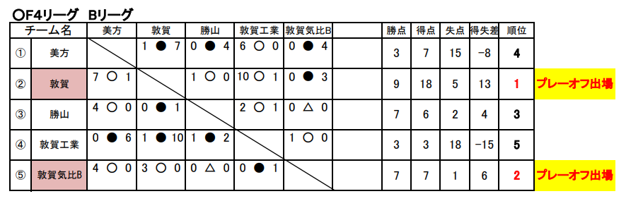 美方、敦賀、敦賀気比2nd、敦賀工業、勝山、坂井3rd
