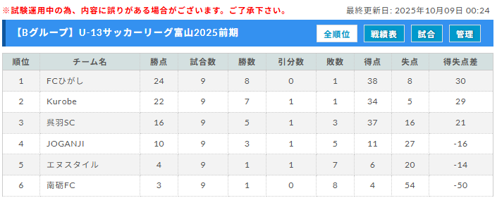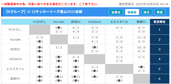 1位:Kurobe、2位:FCひがし、3位:呉羽SC、4位:JOGANJI、5位:南砺FC、6位:エヌスタイル