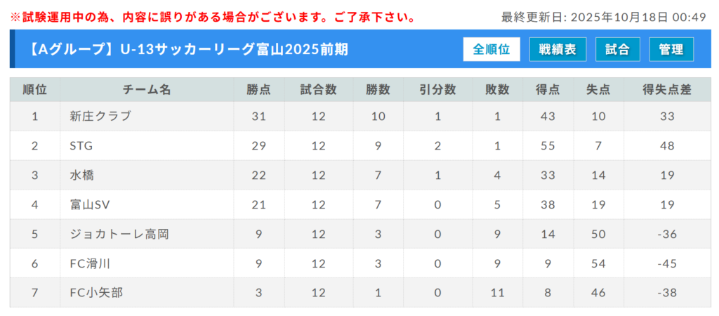 1位:新庄クラブ、2位:STG、3位:水橋、4位:富山SV、5位:ジョカトーレ高岡、、6位:FC滑川、7位:FC小矢部