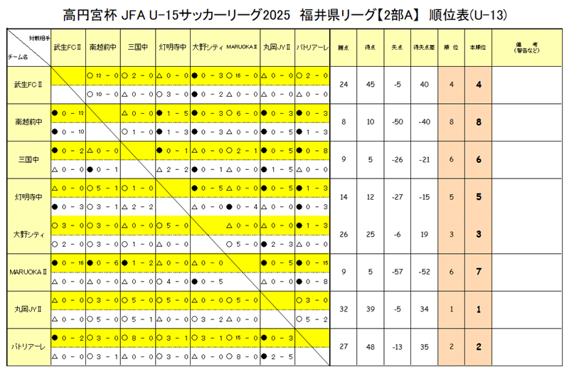 高円宮杯 JFA U-15サッカーリーグ2024 福井(U-13)リーグ表掲載 1部リーグ1位は武生FC!2部~4部結果情報募集!