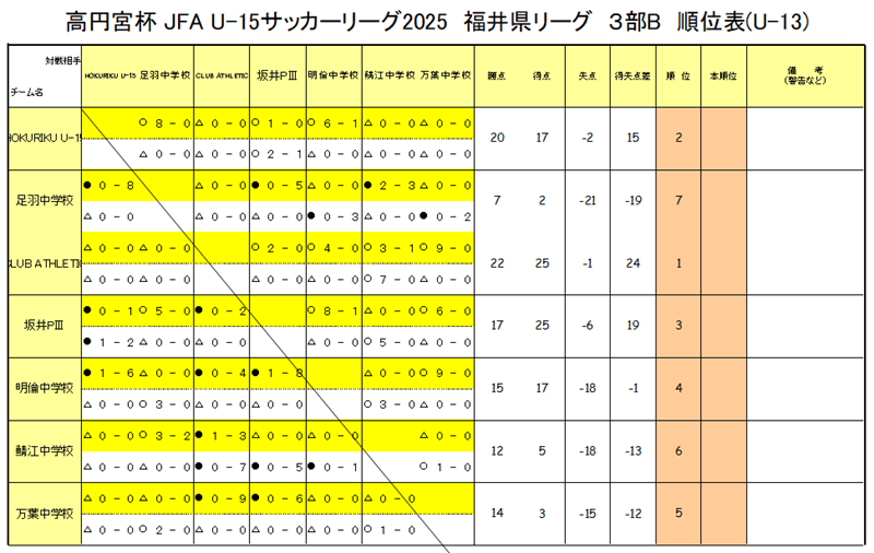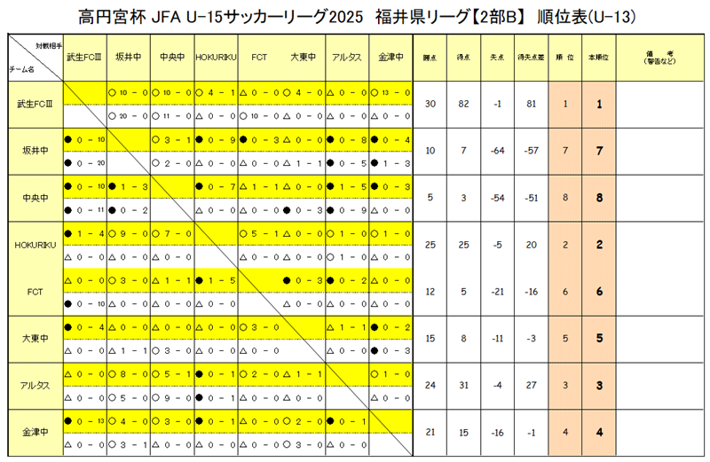 1位:武生FCⅢ、2位:HOKURIKU、3位:アルタスFC、4位:金津中、5位:大東中、6位:FCT三国、7位:坂井中、8位:中央中