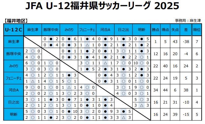 JFA U-12福井県サッカーリーグ2024 最終結果掲載